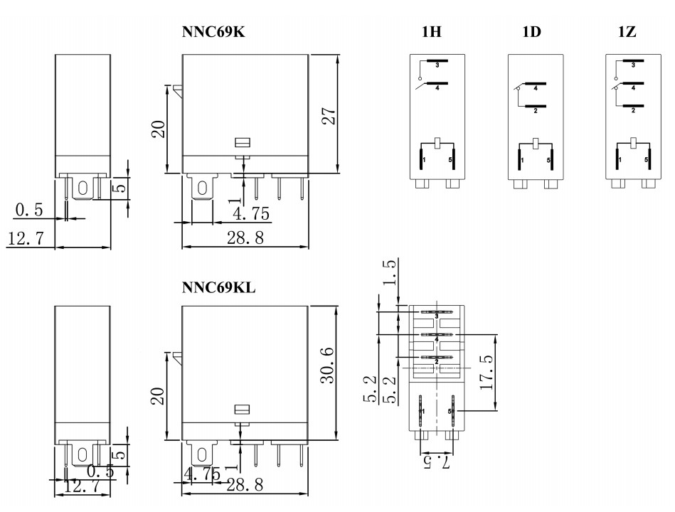 ميزة الاتصال | استمارة | 1Z (SPDT) ؛ 1H (SPST-NO) ؛ 1D (SPST-NC) | 2Z (DPDT) ؛ 2H (DPST-NO) ؛ 2D (DPST-NC) | ||||