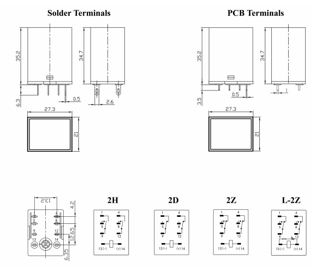نماذج الاتصال: تتضمن تكوينات مثل 2Z (DPDT) ، 3Z (TPDT) ، 4Z (4pdt) ، 2H (DPST-NO) ، 3H (TPST-NO) ، 4H (4PST-NO) ، و 2D (DPST-NC). هذه النماذج تلبي متطلبات التبديل المختلفة وهي مثالية للاستخدامات المتنوعة للمرحلات المصغرة.